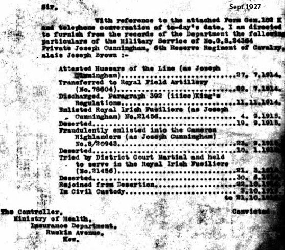 6 Jan 1917 fraudulently enlisted aged 21 as GS/24364 Private Joseph Brown 5th (Royal Irish) Lancers at Waterford. Stated his father was Father Patrick Brown, living at 9 Yorke Road, Herthford, USA