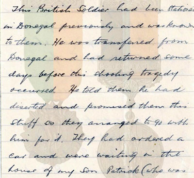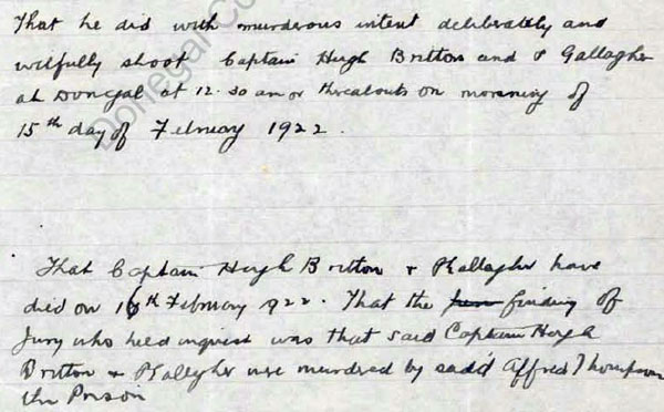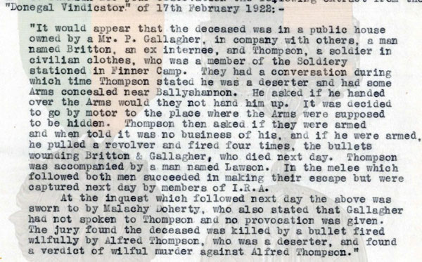 1922 Feb 13 Returned to Donegal claiming to be a deserter from Finner Camp. Made contact with the IRA via an ex-soldier Edward Lawson and offering to sell arms hidden near Ballyshannon to the IRA. Shot Hugh Britton and James Gallagher with a Webley revolver when he was about to be searched during the negotiations at 12:30am. Both died the next day from their wounds.