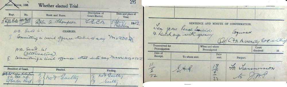 Found not guilty of Murder but guilty of Manslaughter. Sentenced to 10 years Penal servitude and to be discharged with ignominy. It was brought out at the Court Martial that the deceased were armed hence his conviction for manslaughter rather than murder.