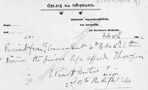 1922 Feb 23 at 5pm Handed over to British military by the IRA. Taken into custody by Major W V L Prescott-Westcar, 2nd Battalion, The Rifle Brigade