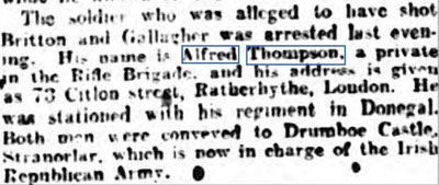 1922 Feb 15 He fled and was arrested later in Laghey at 2pm by the IRA. Taken to Drumboe Castle the General Headquarters for the IRA in County Donegal. Gave his address as 73 Cilton Road, Rotherhithe, London