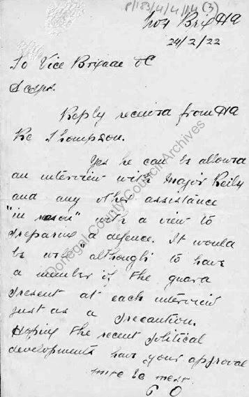 1922 Feb 22 Interviewed Major Hallett Lewthwaite Riley, DSO 2nd Battalion, The Rifle Brigade with a ‘number of the IRA guard’ present at interview