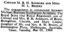 1966 Mar 1. His son Michael engaged (Michael is Gazetted CBE in Dec 1986, by which time he too is a Colonel)