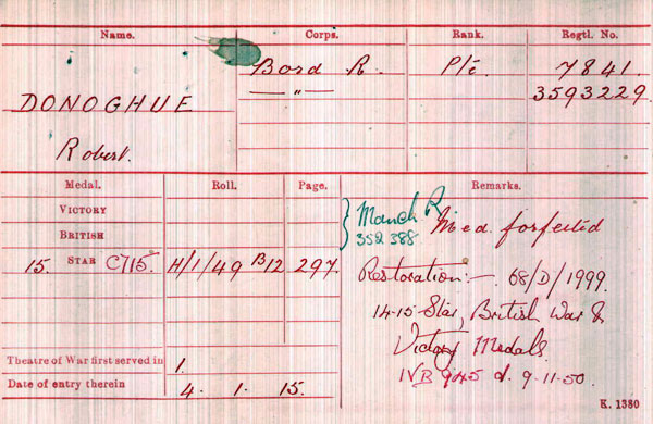 Re-enlisted or re-numbered as 3593229 Private Robert Donoghue, Border Regiment