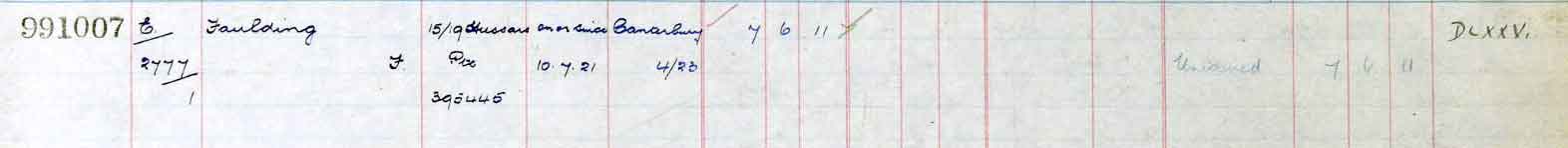 1921 Jan 4. Attested as a Territorial for 4 years , aged 19 at Derby, into the Derbyshire Yeomanry, headquartered at 91 Siddall's Road, Derby. Painter from Brigg Lincolnshire. Nok Mary Helen Faulding, 106 Brook Street, Derby (Mother)