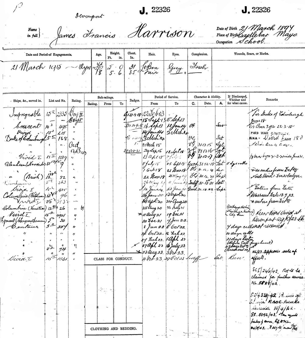 1913 Feb 22. enlisted aged 16 into Royal Navy as J22326 Boy Class II James Francis Harrison, Port Division Devonport. Joined HMS Impregnable a training establishment, HMS Howe was HMS Impregnable between 1911 and 1919. On List15 Supernumeraries