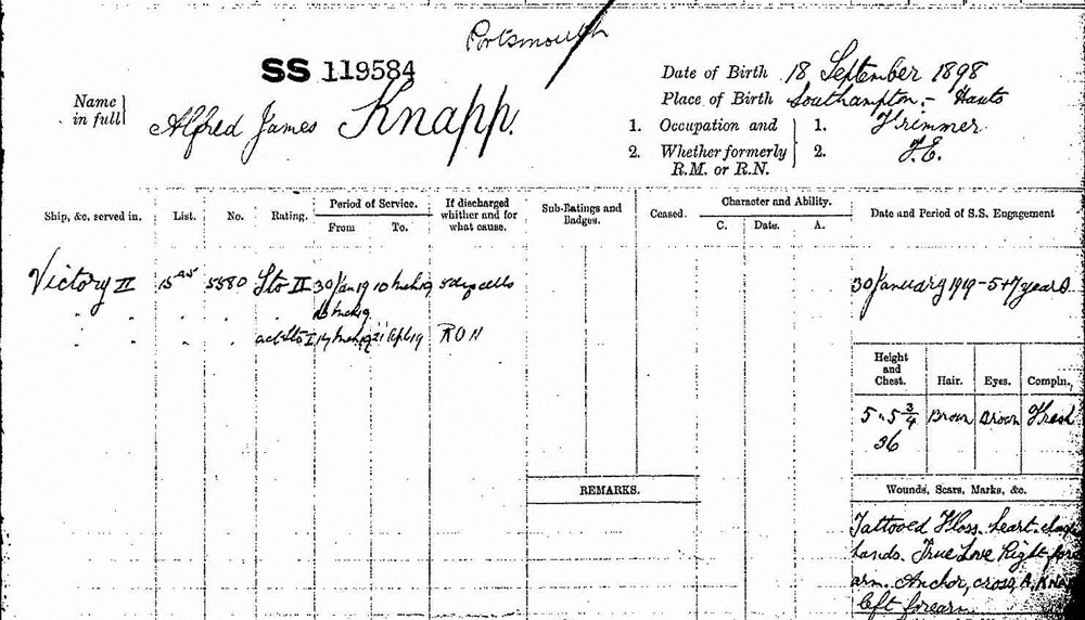 1919 Jan 30. enlisted into the Royal Navy as SS119584, Stoker II Alfred James Knapp, for 5 +7 years