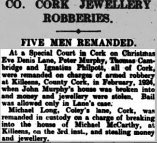 1927 Dec 24. remanded at Special Court, Cork on charges of armed robbery at Killeens Co Cork in Feb 1924