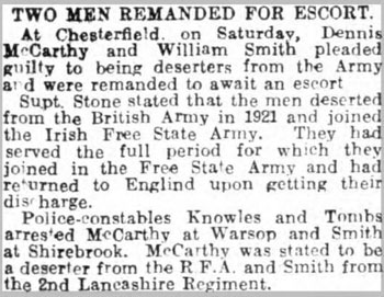 1924 Apr 5. pleaded guilty to been a deserter at Chesterfield. Remanded awaiting Army escort. Private W M Smith, 2nd Battalion Loyal North Lancashire Regiment