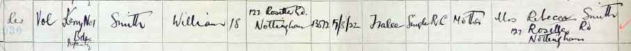 1922 Aug 18. (8030 Res), 13572 Volunteer William Smith, Kerry No1 Brigade Infantry, attested at Tralee. aged 18 (RC). Address 122 Rosetta Road, Nottingham, Nok: Mother Mrs Rebecca Smith, 122 Rosetta Road, Nottingham (See Irish Army Census 1923 list above)