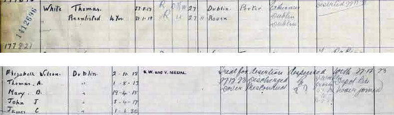 1919 Jan 21. re-enlisted in Rouen for 4 years, occupation Porter from Dublin. His regimental number 177821 would have him joining the 489th Siege Battery, Royal Garrison Artillery which was formed on the 14 Aug 1917 at Deepcut, Surrey, and was disbanded on the 10 Nov 1917 and the men were sent overseas to reinforce other artillery units.While with Royal Garrison Artillery Base Details (groupings of gunners and drivers awaiting posting as replacements to batteries or discharge) at Rouen he re-enlisted aged 28 as a regular for 4 years (discharge would be 21 Jan 1923)