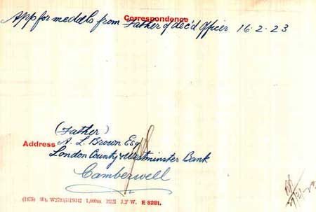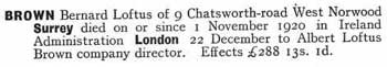 1920 Nov 1. Died Age: 24. Son of Albert Loftus Brown and Mabel Kathleen Brown, of "Holme," Chatsworth Rd., West Norwood, London.