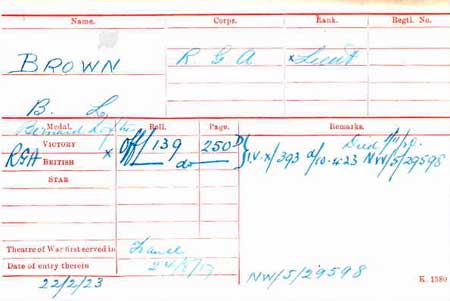 1918 Jan 18 Gazetted MC. Lt. Bernard Loftus Brown, R.G.A. For conspicuous gallantry and devotion toduty. When an observation post could not be found he located and occupied one in a village under heavy fire, and endeavoured to establish and maintain communication.