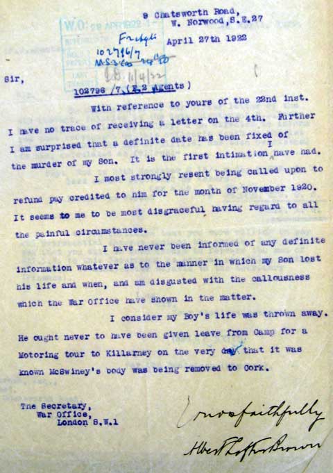 1922 Apr 27. His father is not happy with the communications from the War Office