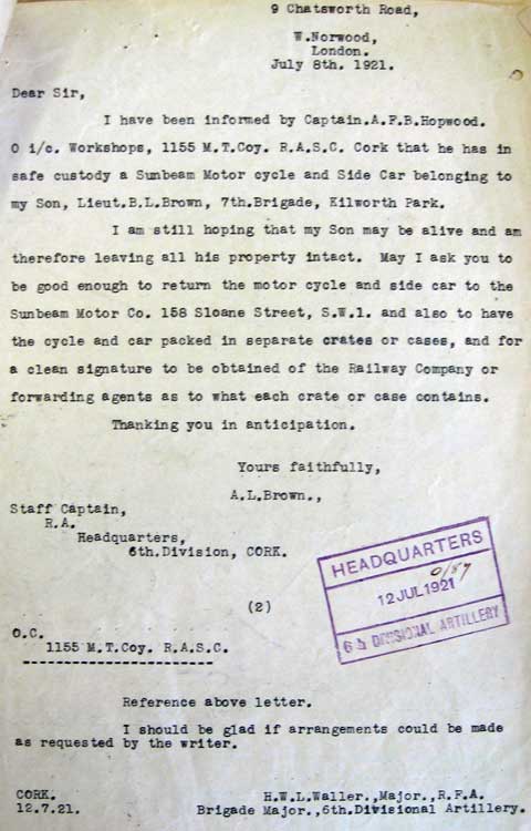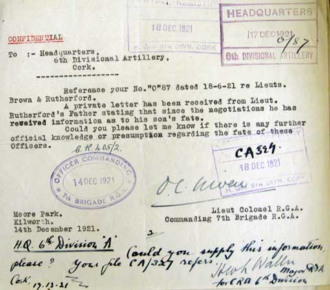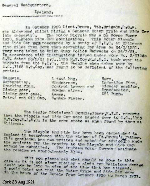 1921 Mar 24. His motorcycle was found at Killeens, 5 miles from Cork. They were in the shed of a farmer called Casey and which was 1/4 mile from the road. The find was accidental as the police were there on an arms raid. Casey was arrested