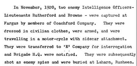 - Charlie Browne of Macroom IRA said that Brown and Rutherford were "dressed in civilian clothes, were armed" and that they were later executed as enemy spies