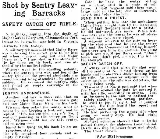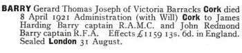 1883 Apr/Jun. Born Cork. Son of John Barry, Esq., Lt.-Col. Royal Army Medical Corps, b 1841 ; m. 1880, Nora, d. of James Harding, Esq., J. P., of Myrtle Hill House, Cork, and formerly of Hanover Hall, Macroom ;