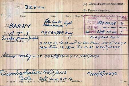 1919 Sep 11. RAF. The undermentioned relinquish their commns. on ceasing to be empld.: — Lt. (Hon. Maj.) G. T. J. Barry (Maj., S. Wales Bord.).