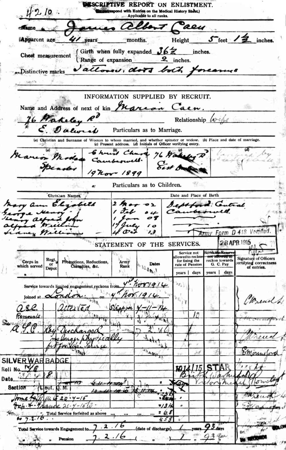 His father RTS/4210 Private James Albert Caen, Army Service Corps (Remount Specials: specially enlisted because for skills with horses). Served from 1914 to 1916