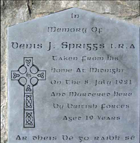 Denis Spriggs joined the IRA aged only 16. He played an active part in the Tan War and, as result of his activities was forced to go on the run. On the 9th July 1921 he had returned home briefly to visit his mother. His presence in the house was betrayed by a neighbour. That night the house was raided by Crown Forces. Denis Spriggs was seized, taken 100 yards from his home to the top of Blarney Street and shot dead.
