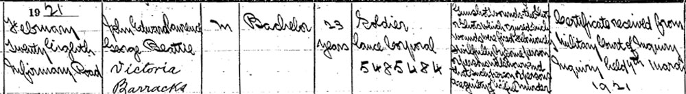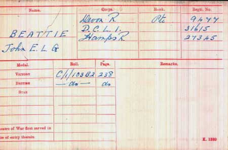 1921 Feb 28. Shot in Cork. He appears to have been shot in Infirmary Road, near the old Blind Asylum, now a hospital. A soldier at the inquest said he heard 5 shots in Infirmary Road. When the firing ceased he and a friend found Beattie's body in the middle of the pavement, with a bullet wound in the region of the heart.