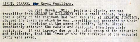 Lieut. Cecil H W Clarke awarded MBE for his actions at Headford Ambush