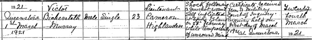 1918 Nov 1. The undermentioned 2nd Lts. to be Lts.Cam'n Highrs.—V. B. Murray.