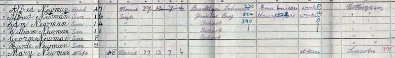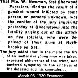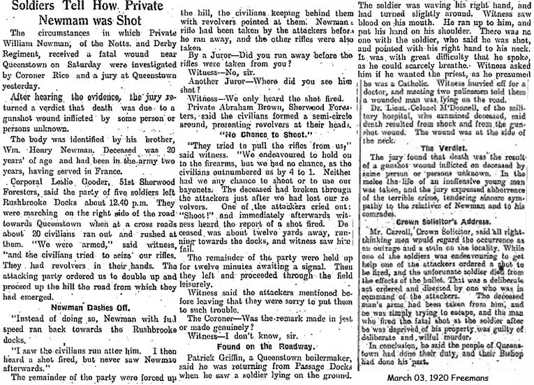 1920 Feb 29. 51st Battalion Sherwood Foresters (Notts and Derby Regiment. Died age 19, as a result of bullet wounds to the neck received when he with four of his comrades were ambushed at Rushbrooke Queenstown County Cork. He was the Son of Alfred Newman, of 6 Arrow Terrace, Fisher Gate, Nottingham