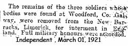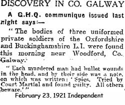 February 22, 1921, the bodies of three British soldiers were discovered by a farmer on the Woodford to Cahir road near the shores of Lough Attorick at Poolagoond near the Clare – Galway county border. The three soldiers had been executed by the I.R.A.’s East Clare Brigade, each been shot in the head. One of them had a label hung around his neck which read “Spies. Tried by courtmartial and found guilty. All others beware.” All three were members of ‘B’ Company, 1st Battalion the Oxford and Buckinghamshire Light Infantry stationed at the Strand Barracks in Limerick City.
