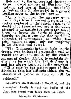 After the soldiers’ bodies were discovered, the British army carried out reprisals by burning houses and killed a man named Grogan.