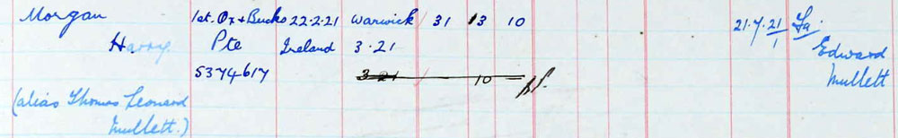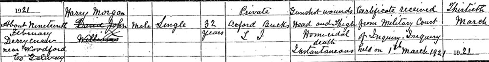1921 Feb 22. Found shot on the roadside having been kidnapped with 2 other Ox & Bucks soldiers.