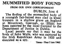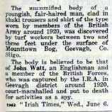 Around this time the IRA in the Conway's Cross/Geevagh area were contacted by a British soldier who also claimed that he had deserted. The IRA were sceptical and the man was court martialled in Gleann Hall. Among the officers involved in the court martial were Alec McCabe, Tom Duignan, Tom O'Donnell and M. J. Marren. The soldier, a lieutenant from the forces at Drumdoe near Ballinafad whose name is given as John Watt, was found guilty of being a spy and was executed. He was buried in a bog and his body was accidentally uncovered by turf cutters in May 1962. It was re-interred in Carrick an Teampall graveyard, Conway's Cross