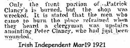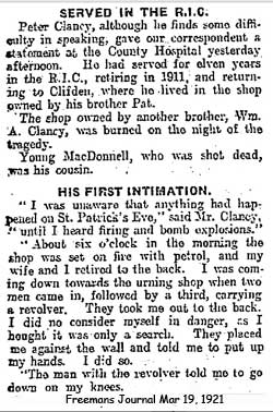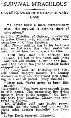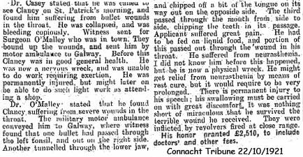 1921 Oct 22. The doctors inquest report suggests that "the ex-constable was put up against a wall, and shot" is closer to the truth than "wounded by a stray bullet." Clancy had received 3 bullets to the head, one through his throat, a second through the lower jaw, and a third through his mouth. All wounds were infliccted by revolvers fired at close range.