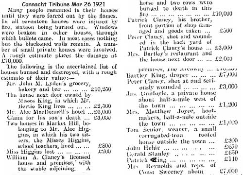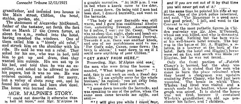 Again these facts appear not to be in dispute. How the buildings came to be burned and how the two casualties has differing tales, but it appears to me that McDonnell was taken outside and shot and that Clancy was put up against a wall and shot. Both by the RIC
