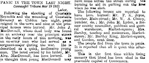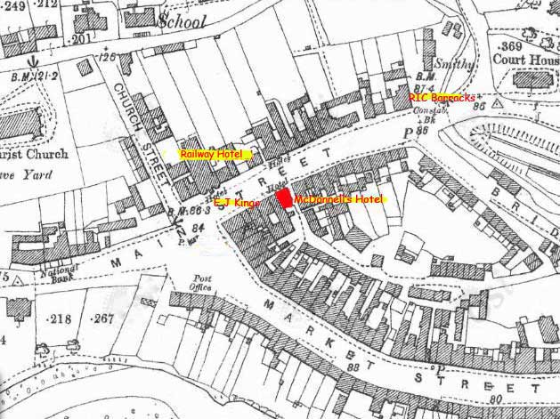 The ambush took place between E J Kings Pub in the centre of the town and The Railway Hotel (now Foyles Hotel) on the opposite side of the street - The Railway Hotel is the double fronted building in the centre of the above photograph. The ambush appears to have been part of a cycle of violence, common to many such incidents in Ireland at that time. Thomas Whelan from Clifden had been executed on 14 Mar 1921 for the murder of Captain G. T. Baggally on Bloody Sunday (and Baggally had been shot because ..). The ambush of the RIC patrol and the death of the 2 RIC men appears to have been reprisal for Whelan's death. The death of the 2 constables in Clifden on 16th March then led to Crown Forces reprisals and the death of 2 more men, and the burning of 16 houses in Clifden. And no doubt this led to further retaliations agains Crown Forces.