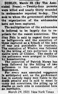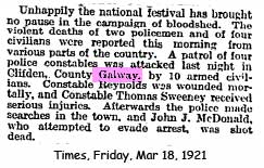 1921 Mar 16. The IRA in Galway ambushed a 4 man RIC patrol in Clifden. Two RIC constables were killed. The IRA flying column of the West Galway (Connemara) Brigade was led by Peter (Petie) Joe McDonnell.