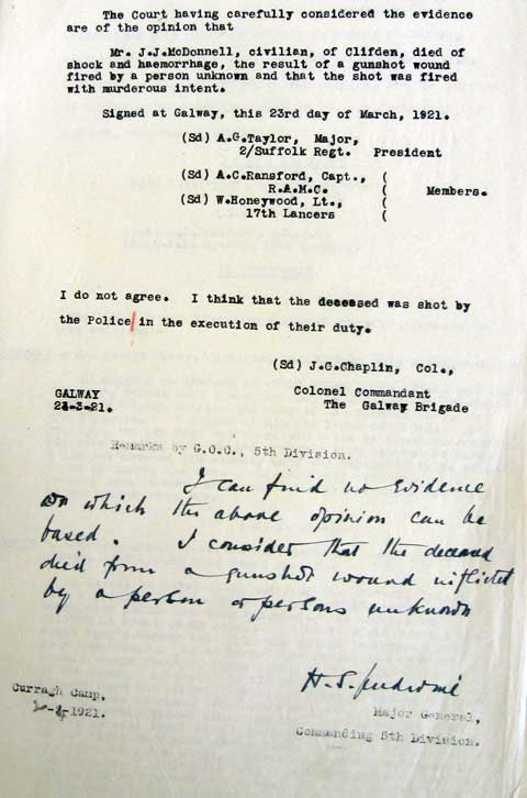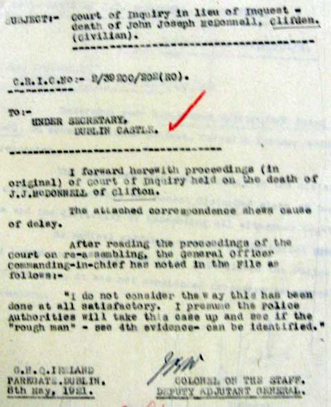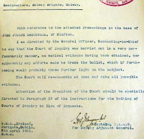 1921 The military inquiry was told that "death was due to shock following bullet wounds to the head" . A police sergeant in charge of 6 RIC men was in the narrow lane near Higgins' house. He heard shouts of "Halt", a civilian ran past, they fired and he fell. McDonnell was fully dressed and wearing a cap