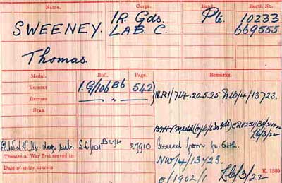 1915 Nov 6. Enlists with Irish Guards. His service record in the Irish Guards survives. He was born at Aughrim and was a labourer. His next of kin is John Sweeney of Aughrim.