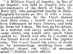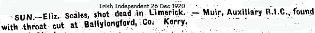 1920 Nov 1. Two RIC men (Constable William Muir and Constable Coughlan) were captured by the Ballylongford Company of the IRA. Constable Muir was brought to Moyvane where he were guarded by the local company. The British Army issued an ultimatum that Ballylongford would be razed to the ground if two men were not released and the Kerry No. 1 Brigade HQ ordered their release. Constable Muir later committed suicide (27th December 1920).