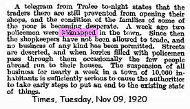 Bakeries were allowed to open on the 8th November, and on the 9th the military took over and posted up a notice: "Business may be resumed in Tralee tomorrow in view of the hardships imposed on loyal subjects. Other means will be resorted to for the recovery of the two police in Sinn Fein custody. Public houses will remain open until the usual hour."