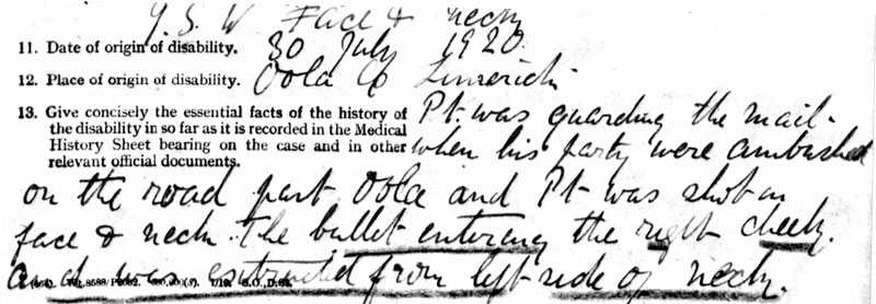 1920 Jul 30 wounded in the ambush on Gen Lucas's lorry. GSW to face & neck