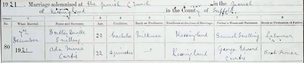 1921 Dec 7 married Ada M Curtis Marriage at Kessingland, Suffolk,
