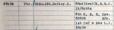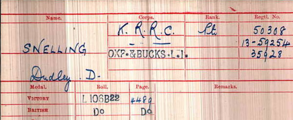 1919 Jan 13 Re-enlisted in Ox & Bucks Light Infantry. He was at that time serving in 6th London Regt, KRR, as # 50308. He then numbered 35908, and later renumbered finally 5373932. Posted France with 2nd Bat Ox & Bucks