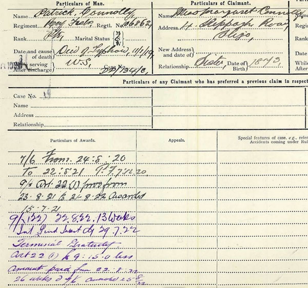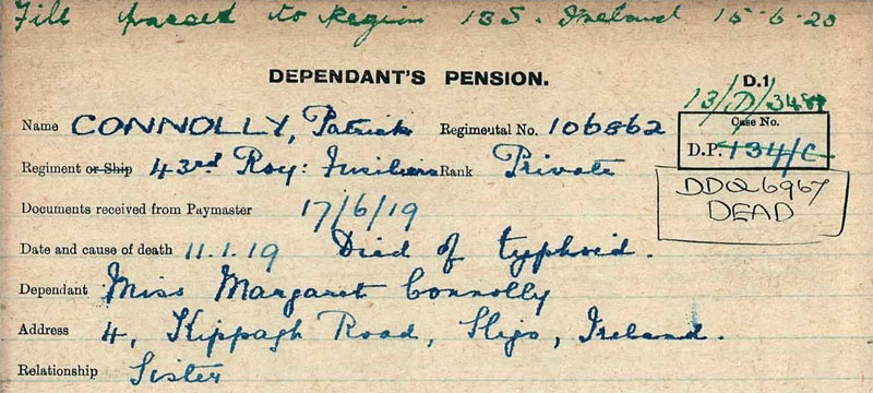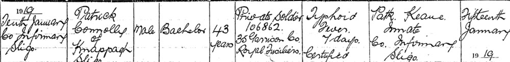 1919 Jan 11. died of typhoid fever aged 44 at the Sligo Infirmary, Ballymote, Ireland . CWGC