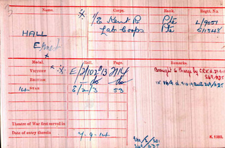 The pension cars for In WW1 indiate that served under the alias of Ernest Hall, #9051 in East Kent Regt