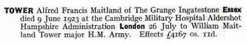 1920 Dec 24 The undermentioned Gentlemen Cadets, from the Royal Military College, to be 2nd Lts, —Essex R. Alfred Francis Maitland Tower.