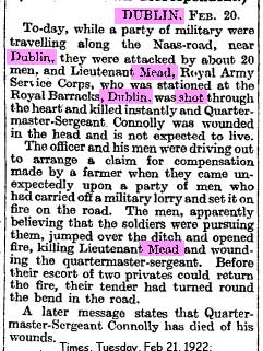 1922 Feb 20. Shot with Lt Mead in a curious attack.Note date given on Soldiers Effects is wrong