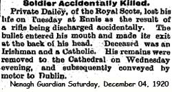 1920 Nov 23. The report says an accidental discharge of a rifle. He was Scots, not Irish