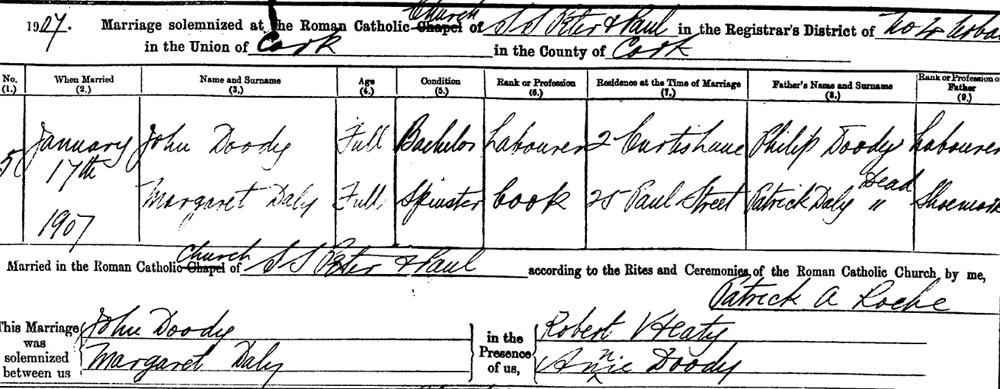 1919 April 3 . died of pneumonia at the Military Hospital on Bere Island, aged 43 CWGC . Husband of M. Doody, of 30, Henry St., Cork.