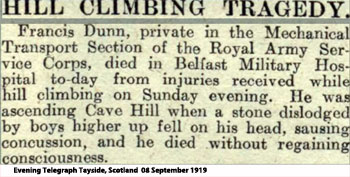 1919 Sep 8 Died in Belfast after a climbing accident.. The CWGC gives 615th M.T. Coy. as his unit.